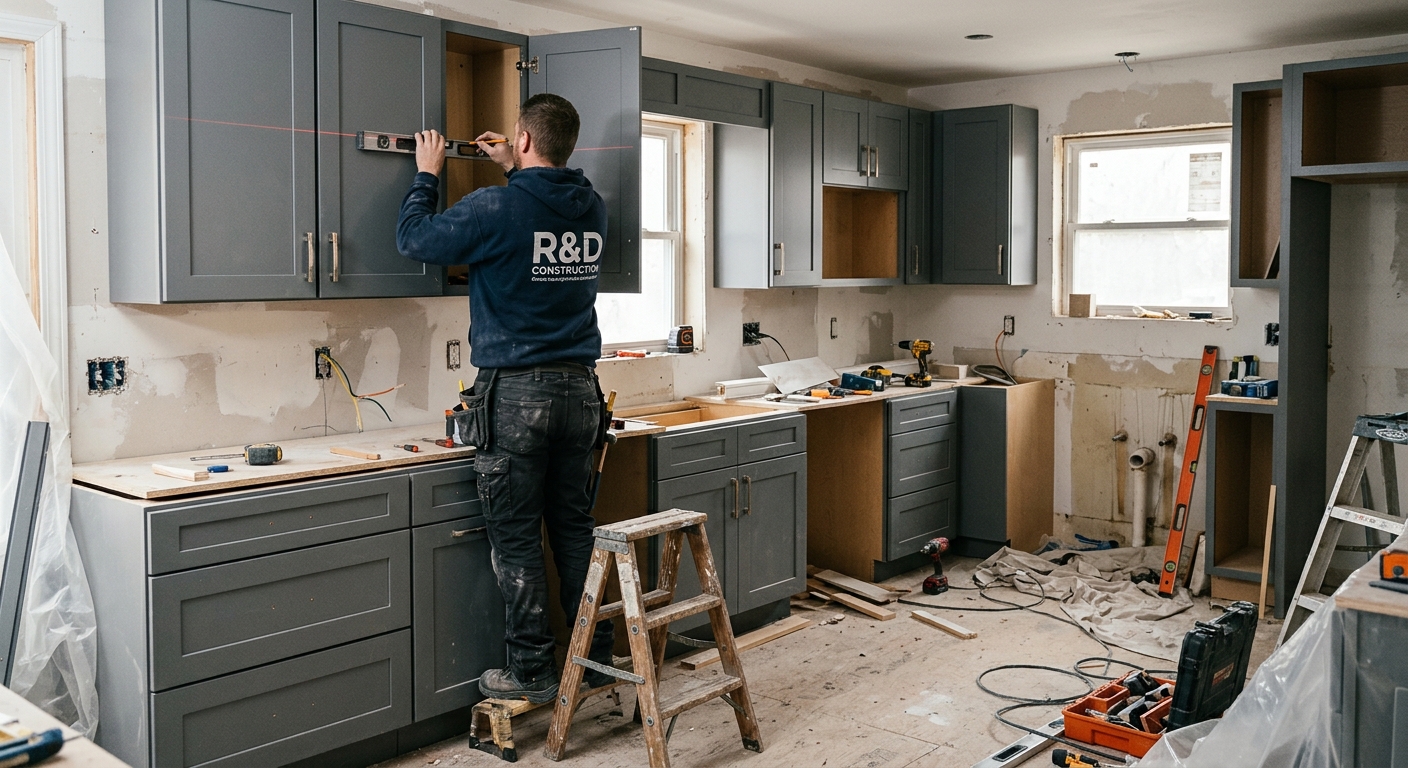 Our contractors work with top cabinet lines — KraftMaid, Merillat, Waypoint, Medallion — and top countertop brands. All work backed by a written workmanship warranty.