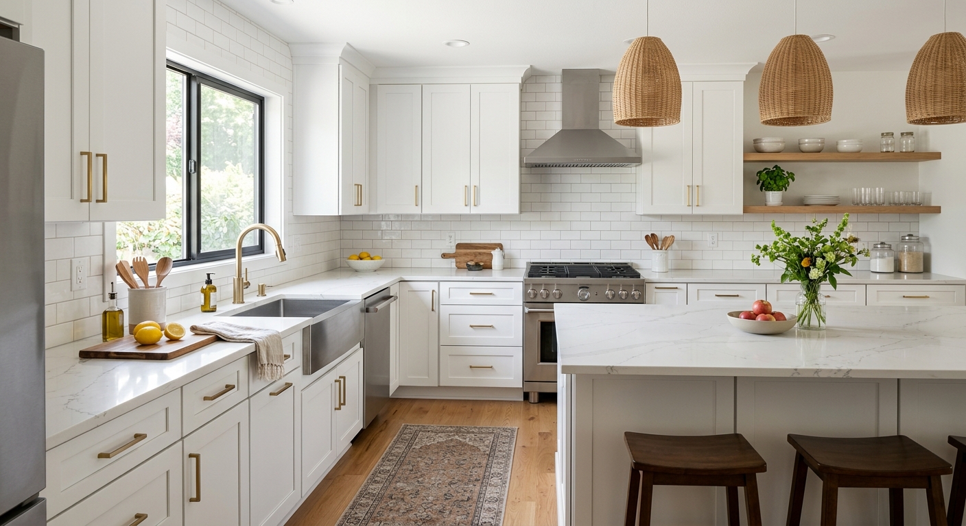 Our contractors work with top cabinet lines — KraftMaid, Merillat, Waypoint, Medallion — and top countertop brands. All work backed by a written workmanship warranty.