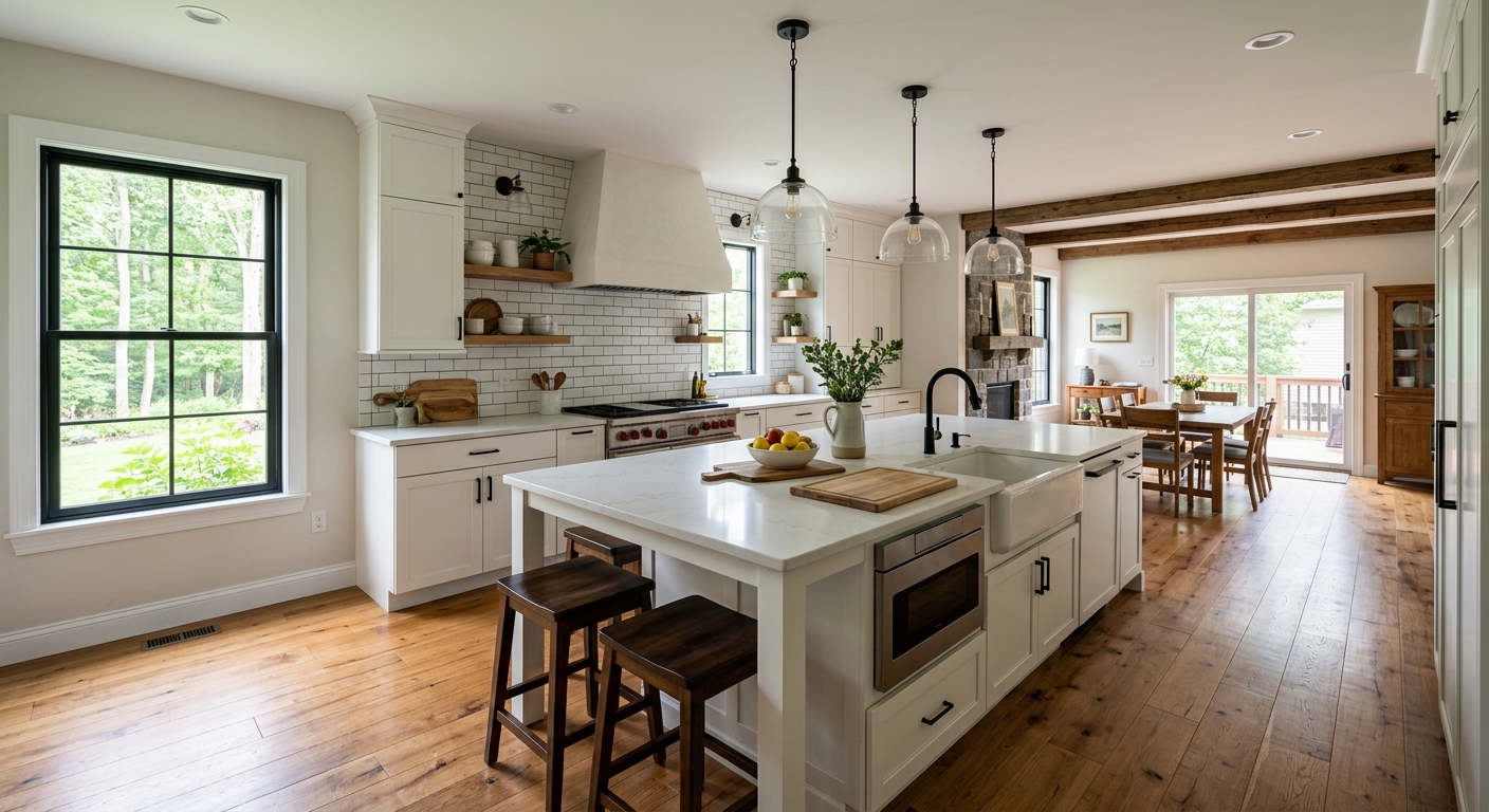 Complete gut-to-finish kitchen renovation for Greene homes. Our licensed contractors handle demolition, structural changes, new cabinets, countertops, flooring, backsplash, appliance installation and all trades (plumbing, electrical, drywall). Most mid-size kitchens completed in 4-8 weeks.